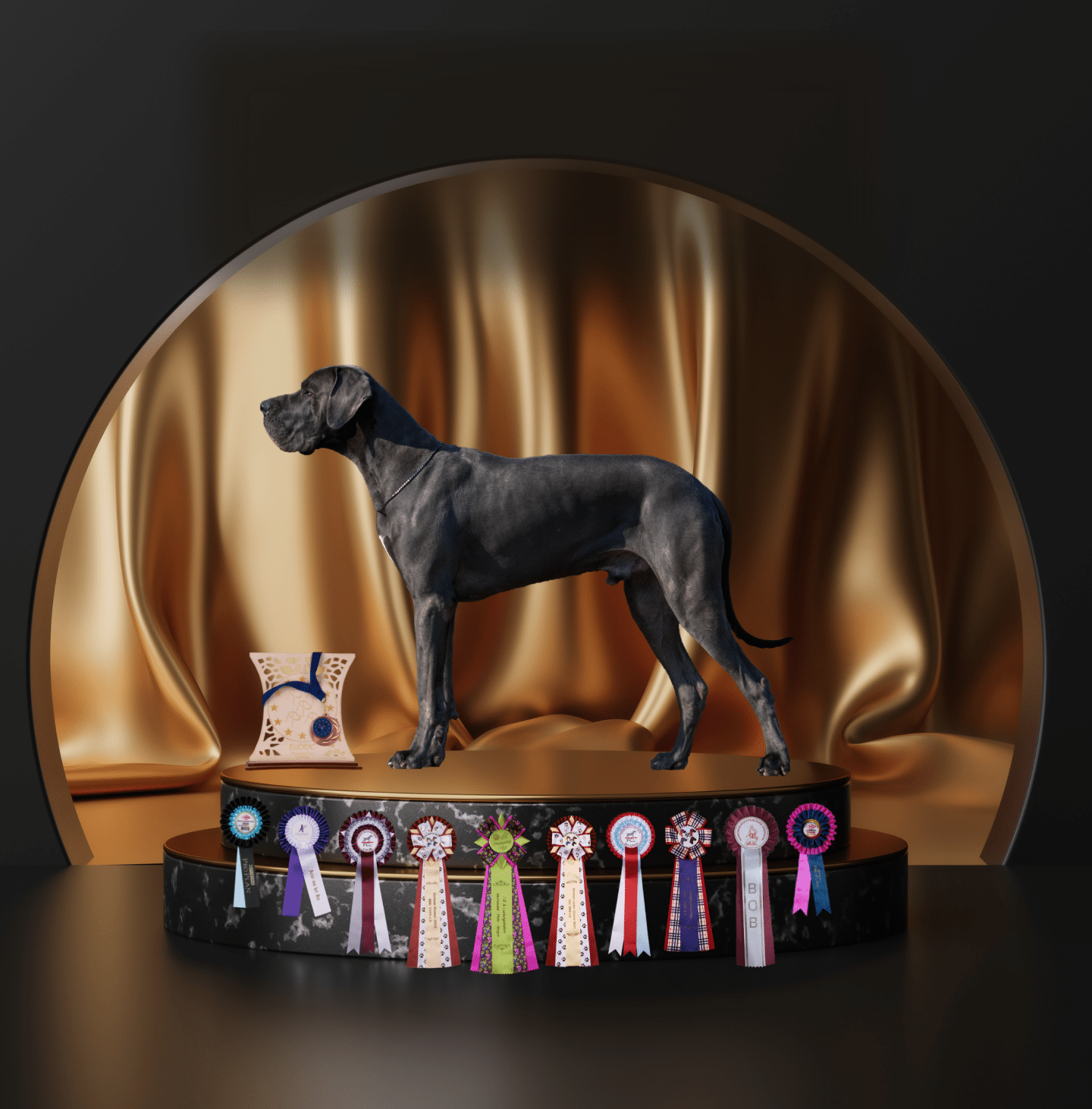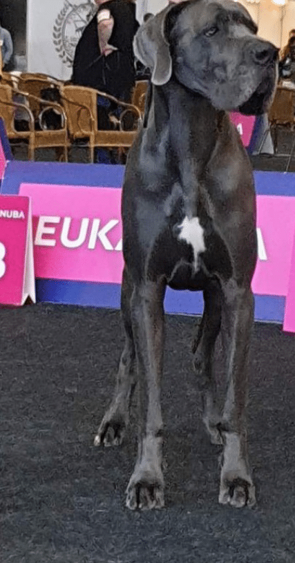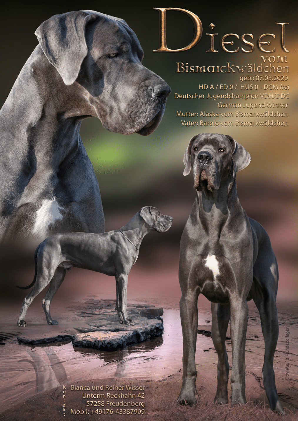 Für uns war klar, dieser große, blaue und charakterlich einwandfreie, gesunde Rüde muss in die Zucht! Somit machten wir mit nur 18 Monaten die Zuchtzulassung und er wurde offiziell als Deckrüde zugelassen! Durch Diesels durchweg gute Leistungen und sein entspanntes Wesen beschlossen wir, dass Diesel in die Deutsche Doggenzucht geht. Eine Dogge,wie Diesel, kann die Zucht der Rasse nur bereichern!