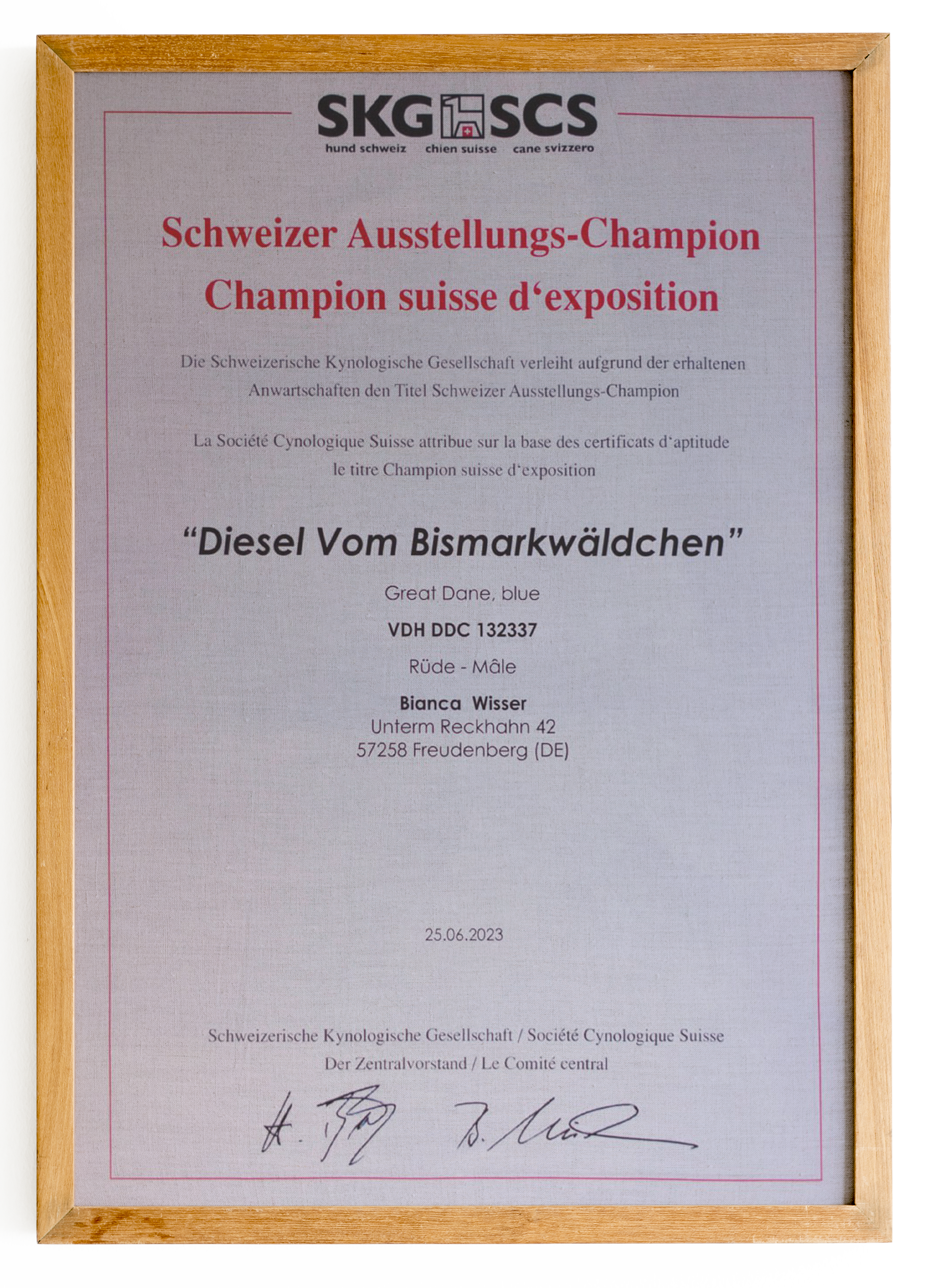 Am 25.6.2023 wurde der Schweizer-Ausstellungs-Champion-Titel verliehen.